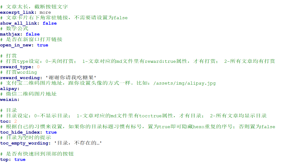 这里主要对“截断按钮文字”进行说明,如果自己的博文较长,此时直接部署到博客上会使博文全部显示,而比较合理的方式是只显示文章的一部分,“截断按钮文字”即实现这个功能,具体用法是在自己的博文中要截断的地方输入<!-- more -->(“more”关键字可以进行修改),即可实现前后的截断,示意图如下所示: